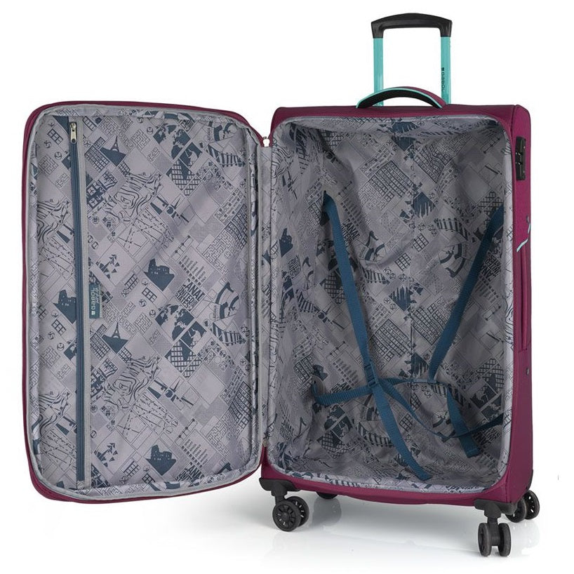 Валіза Gabol серії Giro оснащена кодовим замком системи TSA. На фасадній та бічній частинах розташовані кишені. У середині має ремені для фіксації речей. Валіза легка, маневрена та зручна для транспортування.