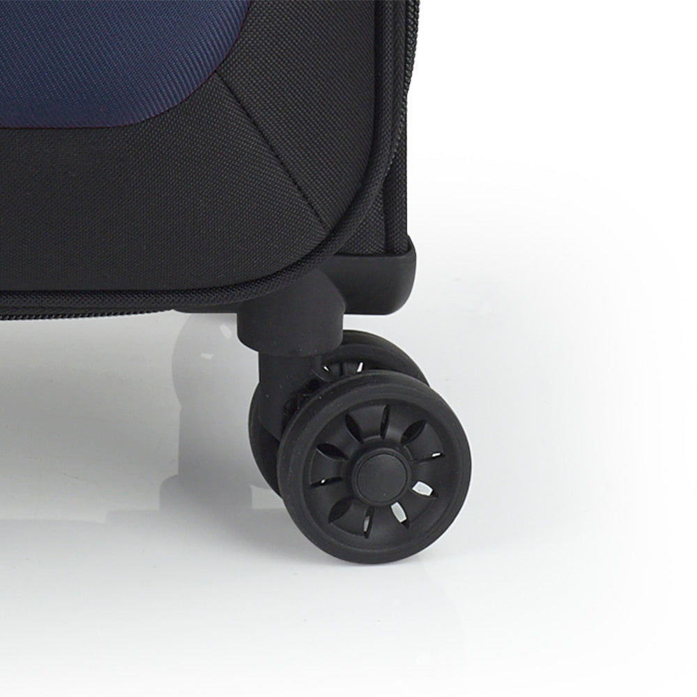 Валіза оснащена чотирма повноповоротними колесами з можливістю незалежного розвороту кожного колеса на 360°. Системою передбачено рівномірний перерозподіл навантаження на кожне колесо, що у свою чергу сприяє плавному руху та маневреності валізи, докладаючи при цьому мінімум зусиль. Колеса виготовлені із високотемпературного термопластичного поліуретану (TPU). Матеріал має міцність порівнянну з пластиком, гнучкістю силікону, а також має підвищену стійкість до перепадів температур. Відмінною особливістю коліс із TPU матеріалу є зниження шуму до мінімуму під час руху валізи по нерівній поверхні. Завдяки стійкості до стирання матеріал коліс відрізняється тривалим терміном експлуатації.