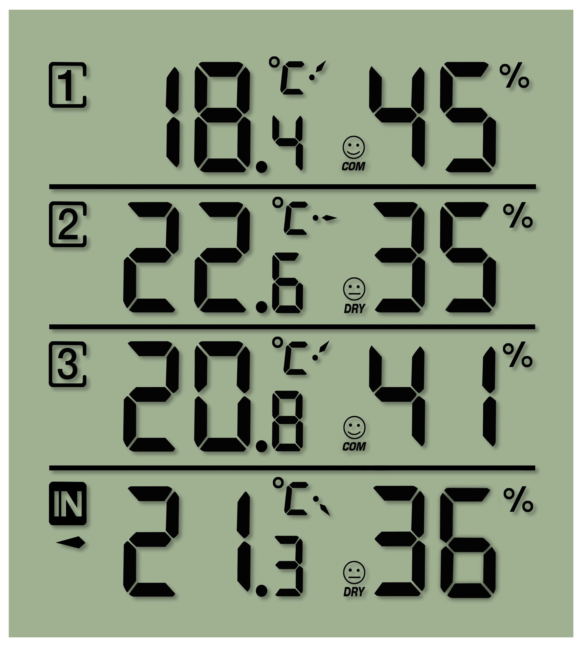 - Комплексный показатель, который измеряет соотношение температуры и влажности воздуха и отображает общий уровень комфорта в помещении в виде символов "грустное" лицо(влажно), "нейтральное" лицо(сухо), "весёлое" лицо (комфортно). Сухо: уровень влажности в помещении от 20% до 40%; Комфортно: уровень влажности в помещении между 55% и 65%; Влажно: уровень влажности в помещении между 66% и 95%.