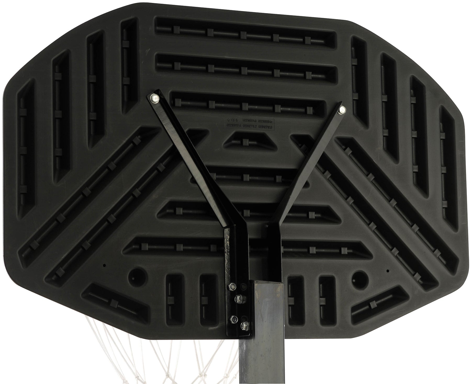- Основа з чорного формованого поліетилену, оснащена колесами спереду, її можна наповнити водою або піском для забезпечення стійкості під час гри. Два дренажні отвори дозволяють легко наповнювати та спорожняти основу.