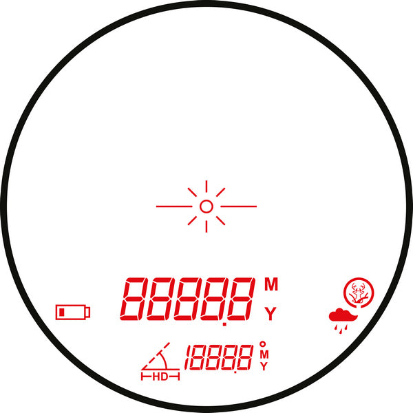 - HD (Horizontal Distance) - для виміру дистанції до об'єкта по горизонталі (проекції реальної дистанції на горизонтальну поверхню). Дуже корисно, що в даному режимі одночасно відображається реальна дистанція до об'єкта та її проекція на горизонтальну вісь. Такий режим необхідний для обліку траєкторії падіння кулі при полюванні в горах, коли ведеться стрілянина під великим кутом до горизонту. У цьому режимі відображається знак кута з написом HD.