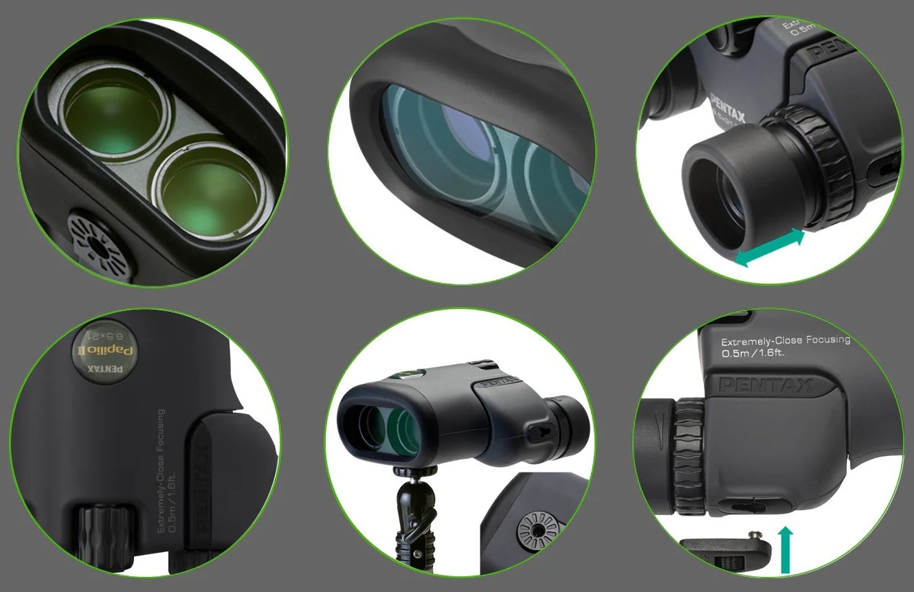 Компактний бінокль Pentax UP 6.5x21 Papilio II (62001) відповідає сучасним вимогам та стандартам: повне багатошарове просвітлення лінз, призми з високоякісного оптичного скла BaK4. Оновлене покриття лінз з покращеним світлопропусканням створює кришталево чітке зображення. Бінокль Pentax UP 6.5x21 Papilio II унікальна модель. Завдяки механізму автоматичної компенсації зміщення поля зображення правого та лівого монокулярів при фокусуванні, забезпечується унікально коротка дистанція спостереження в бінокль Papilio – лише 50 см! Бінокль серії Papilio призначений не тільки для макроспостереження з відстані 50 см, користувач також можете детально спостерігати за будинками архітектури, зоряним небом чи спортивними змаганнями. Корпус виробу має гумове покриття яке сприяє додатковому захисту від механічних пошкоджень. Модель бінокля Pentax UP 6.5x21 Papilio II (62001) призначена для використання під час подорожей, спостереження за дикою природою, тощо.