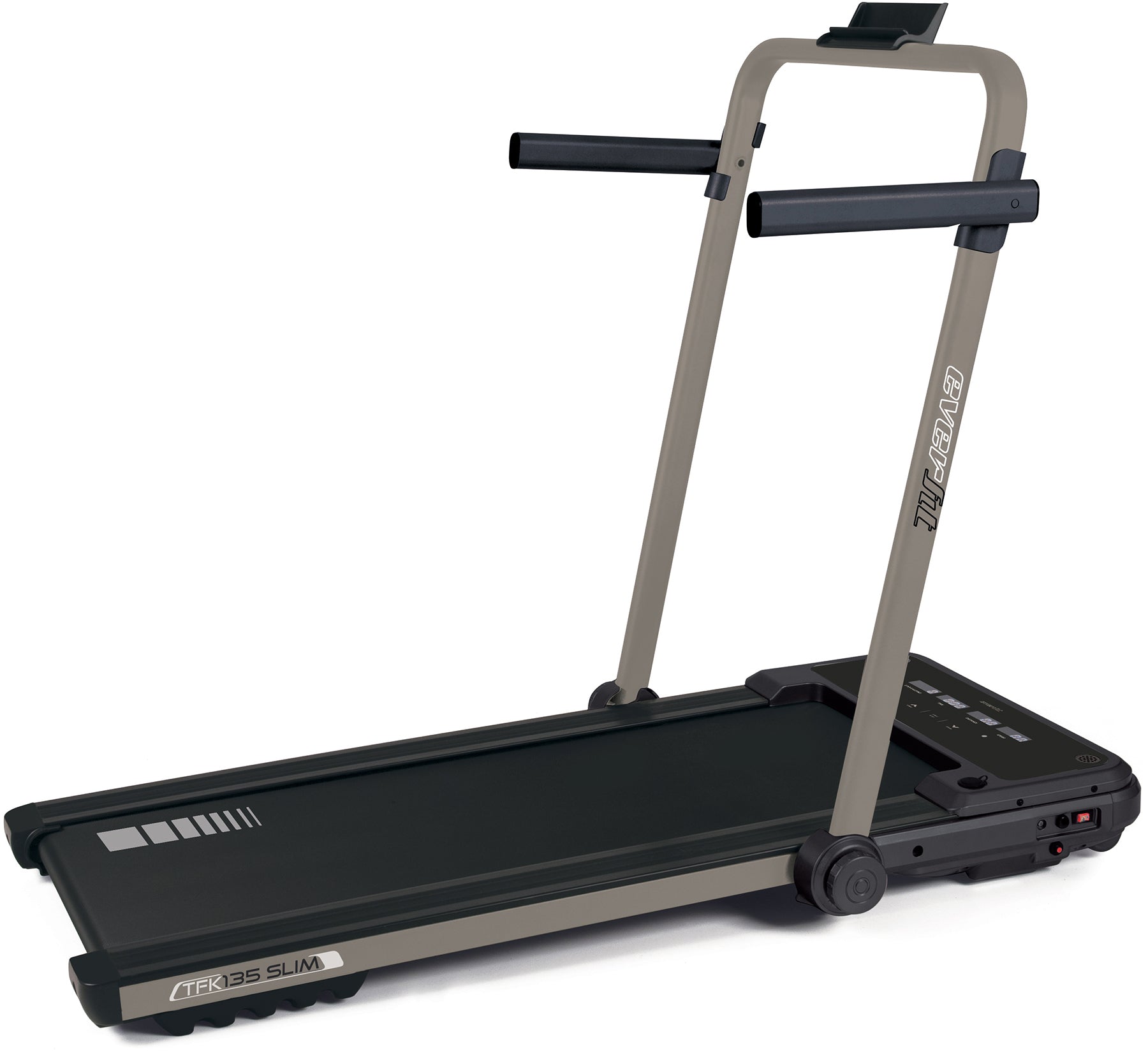 Бігова доріжка Everfit Treadmill TFK 135 Slim Pure Bronze (TFK-135-SLIM-B) із лінійки Slim Line італійського виробника Garlando S.p.A. призначена для спортивної ходьби та бігу в домашніх умовах. Модель оснащена попередньо зібраною рамою та транспортувальними роликами, завдяки чому її легко переміщати по квартирі. Бігова доріжка проста в управлінні, має сучасний елегантний дизайн і гарні технічні характеристики. Тренажер розрахований на максимальне навантаження до 90 кг і дозволяє розвивати швидкість від 0,8 до 8 км/год. Бігове полотно розміром 112 х 40 см достатнє для тренування користувачам зростом до 180 см. Зрозумілий дисплей із чотирма білими світлодіодними екранами знаходиться на панелі двигуна, де ви можете переглядати інформацію про швидкість, дистанцію, час, витрату калорій і кроки. Бігова доріжка Everfit Treadmill TFK 135 Slim Pure Bronze (TFK-135-SLIM-B) має підставку для смартфона/планшета, знімні поручні для додаткової безпеки, пульт дистанційного керування, а також вбудовані динаміки для з'єднання по Bluetooth і автоматичну систему змащування бігового полотна.