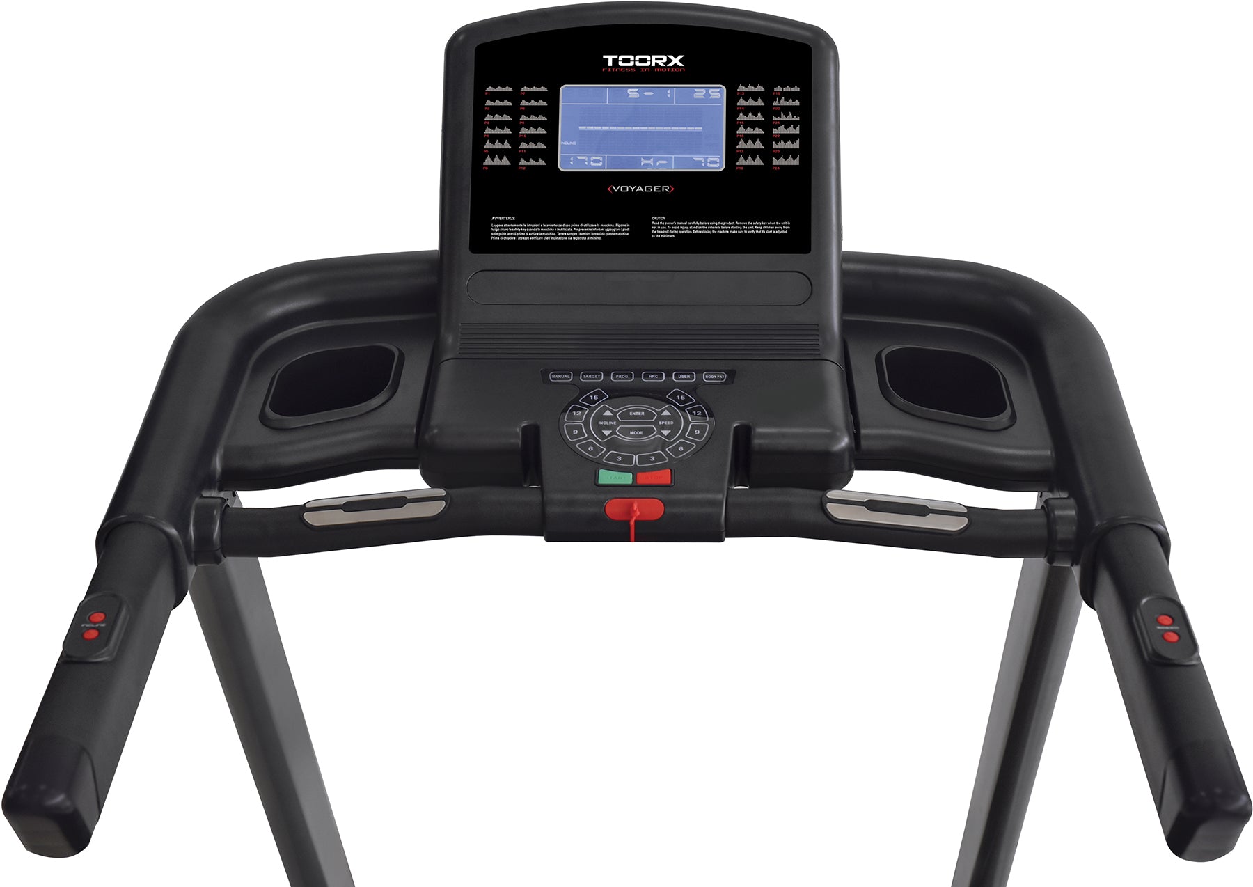 Бігова доріжка Toorx Treadmill Voyager (VOYAGER) від італійського виробника Garlando S.p.A. призначена для спортивної ходьби та бігу в домашніх умовах. Модель розрахована на максимальну вагу користувача до 120 кг і має потужний двигун постійного струму 2,75 к.с., який дозволяє розвивати швидкість від 1 до 18 км/год. Бігове полотно розміром 141 х 48 см із можливістю регулювання нахилу від 0 до 15% як кнопками на панелі керування, так і за допомогою кнопок, розташованих на поручнях. Система амортизації Soft Tech знижує навантаження на суглоби та мінімізує ризик отримання травми в процесі занять. Консоль тренажера з LCD-дисплеєм із блакитним підсвічуванням оснащена різноманітними програмами як для підготовлених користувачів, так і для початківців. Вбудовані сенсорні датчики вимірювання пульсу будуть доречними під час тренування по одній із чотирьох пульсозалежних програм. Бігова доріжка Toorx Treadmill Voyager (VOYAGER) має складану конструкцію та транспортувальні ролики, завдяки чому її легко переміщати по квартирі.
