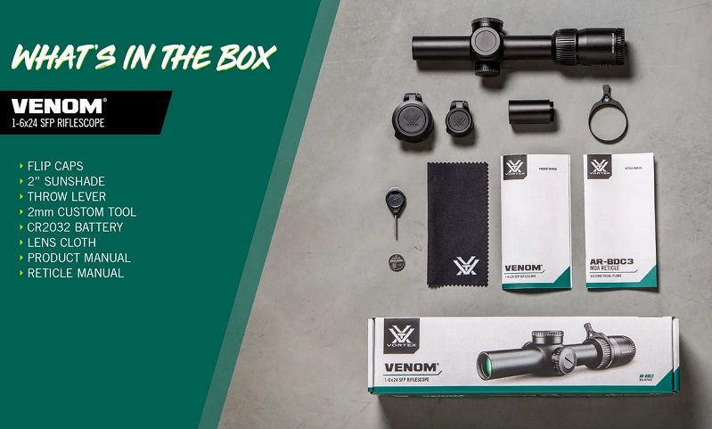 Приціл оптичний Vortex Venom 1-6x24 SFP AR-BDC3 MOA (VEN-1601) є заміною аналогічного прицілу серії Strike Eagle 1-6x24 AR-BDC3 (MOA) (SE-1624-2) який був знятий з виробництва. Приціл створено для точної стрільби на близьких та середніх дистанціях та має кратність збільшення 1-6х. Прицільна марка розташована у другій фокальній площині, шляхом чого її масштаб залишається незмінним при зміні кратності. Корпус виготовлено з алюмінію вкритого анодованим покриттям, стійким до механічних пошкоджень.