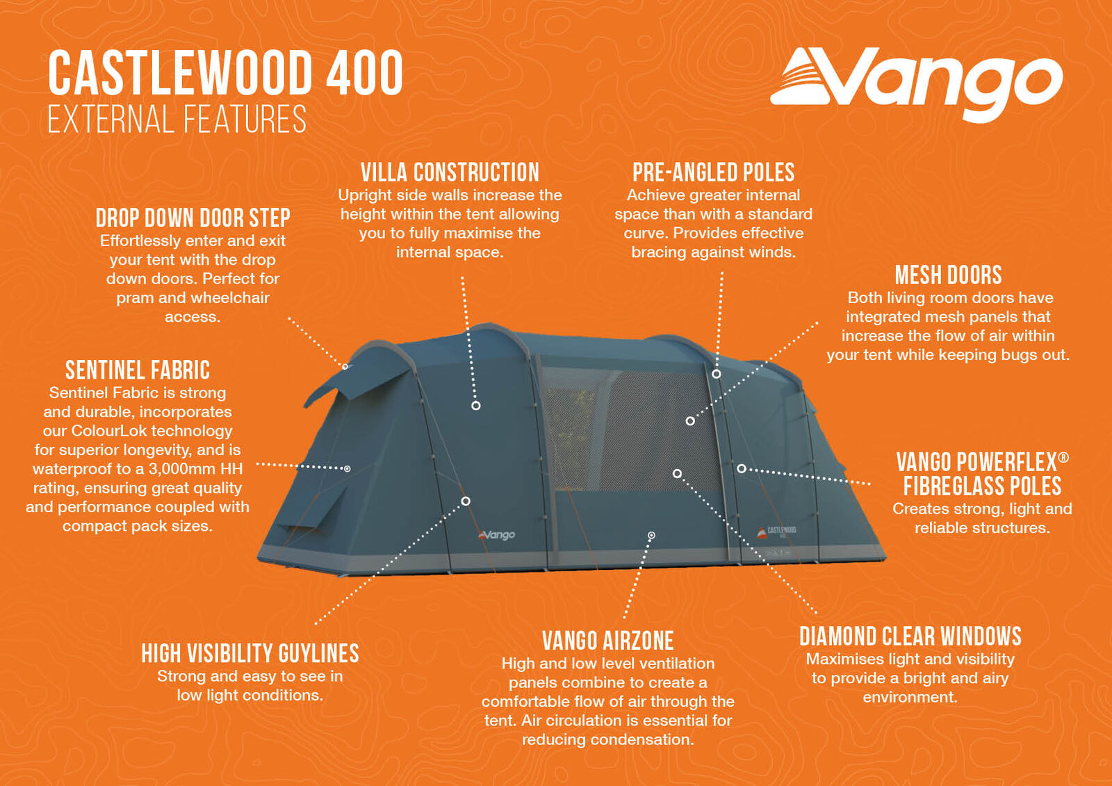 Castlewood 400 — це чотиримісний намет з дугами скловолокна Powerflex®, який має вертикальне розташування. Окремі спальні вміщують до 2 осіб і забезпечують більшу конфіденційність порівняно зі стандартним дизайном намету. Castlewood розроблено спеціально для кемперів, які віддають перевагу більш приватним спальним зонам, і ідеально підходить для сімей або пар, які хочуть мати окремий спальний простір із великою вітальнею посередині. Житловий простір включає великі вікна Diamond Clear, які дозволяють світлу проникати в житлову зону вдень, а вночі їх можна закривати відкидними шторами. Тканина Sentinel забезпечує низький розмір і вагу упаковки, забезпечуючи при цьому якість і довговічність Vango. Спати можна довше завдяки тканині для спальні Lights-Out®, розробленій для мінімізації ранкового світла.