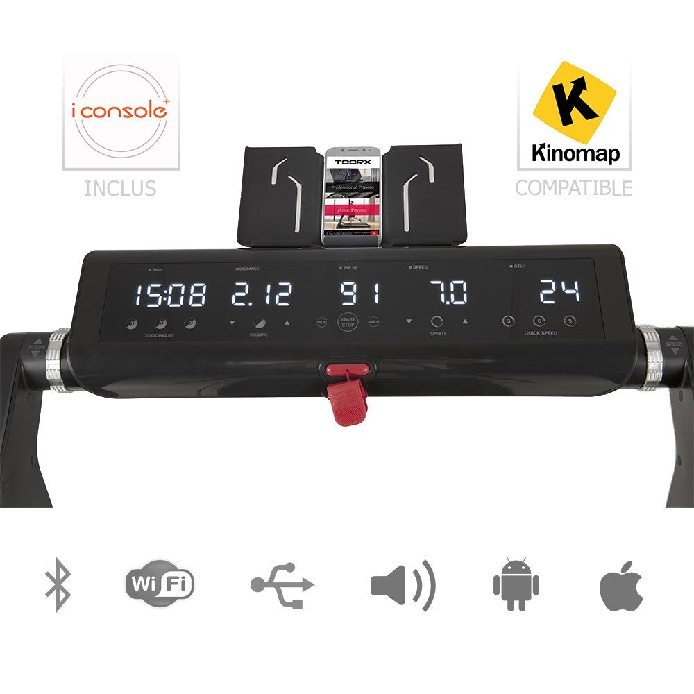 Мультимедійні можливості: Вбудовані Bluetooth-динаміки та підтримка додатків через APP READY 3.0 (USB-порт для TRX APP GATE 3.0, опціонально) дозволяють інтегруватися з такими додатками, як iConsole+, Zwift та Kinomap (підписки не включені). TRX APP GATE 3.0 (продається окремо) - це інноваційна функція, яка відкриває можливість інтеграції бігової доріжки з сучасними фітнес-додатками через спеціальний адаптер.