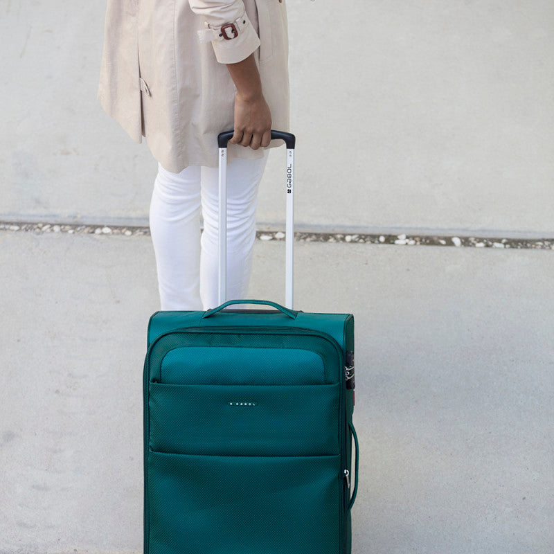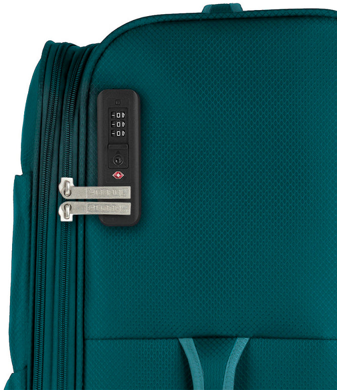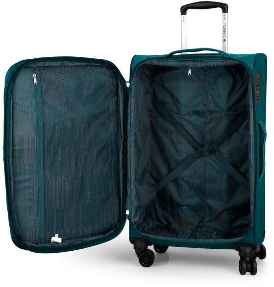 Валіза Gabol Cloud (M) Turquoise (114046-018) одна з найлегших у своєму класі. Модель оснащена кодовим замком TSA системи для підвищення безпеки. Каркас дна легкий та міцний. На фронтальнійній частині розміщено дві кишені на блискавці. Внутрішній простір має одне основне відділення з ременями для фіксації речей. Вона легка, маневрена і зручна для транспортування.