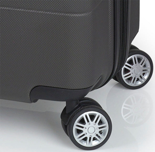 Валіза оснащена чотирма колесами з можливістю незалежного розвороту кожного колеса на 360°. Система передбачає рівномірний перерозподіл навантаження на кожне колесо, що своєю чергою сприяє плавному руху та маневреності валізи, докладаючи при цьому мінімум зусиль. Колеса виготовлені з високотемпературного термопластичного поліуретану (TPU). Відмінною особливістю коліс із TPU матеріалу є зниження шуму до мінімуму під час руху валізи нерівною поверхнею. Завдяки стійкості до стирання, матеріал коліс відрізняється тривалим терміном експлуатації. Валіза легка, маневрова та зручна для транспортування.
