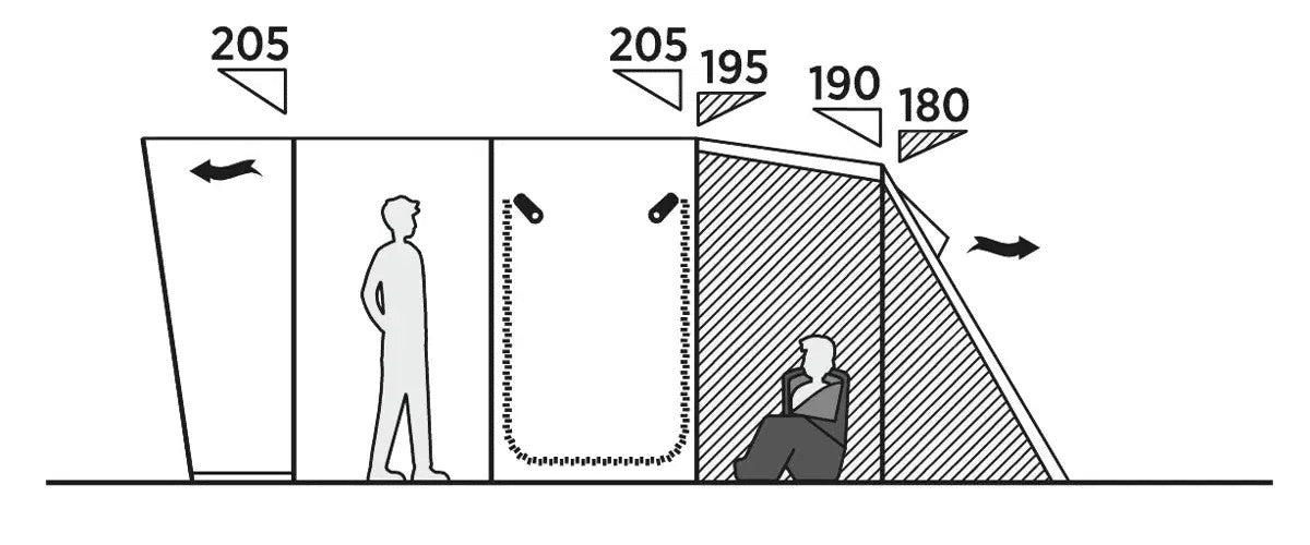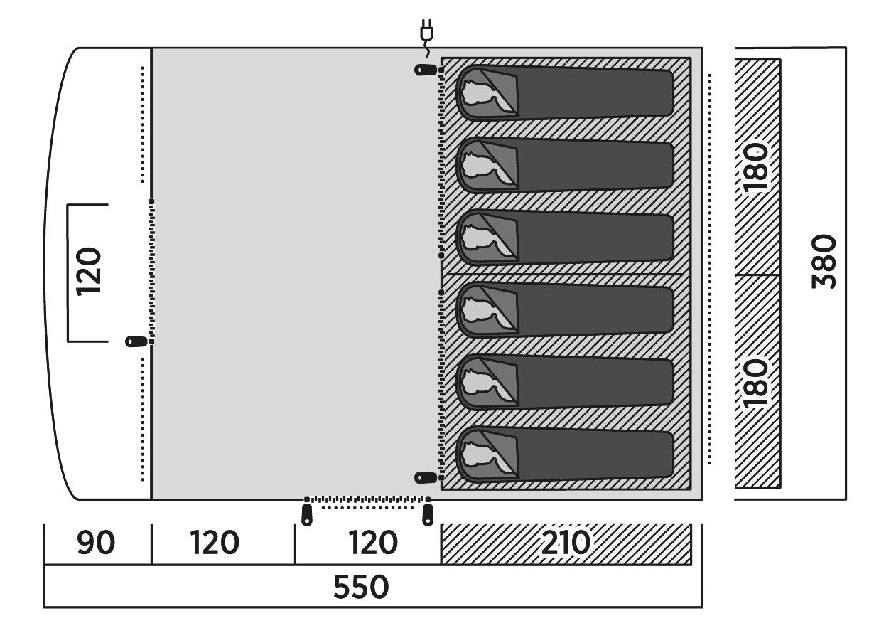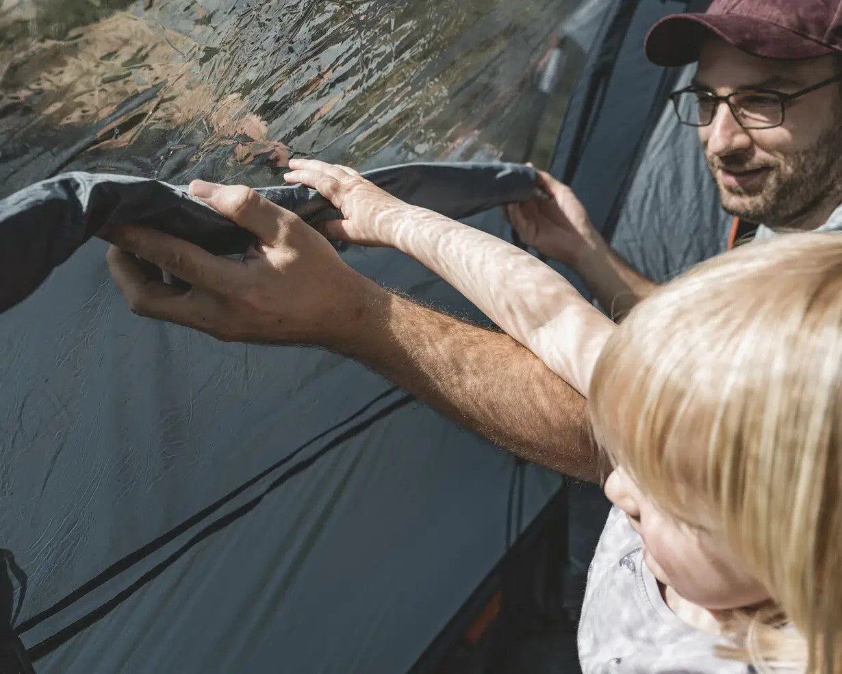 Система SleepTight із темними матеріалами та оптимальною вентиляцією забезпечує комфортний сон. Виокремлені спальні відсіки для приватності можна зняти за потребою. Вшита підлога захищає від протягів та комах, а кишені-органайзери й доступ до електромережі додають зручності.