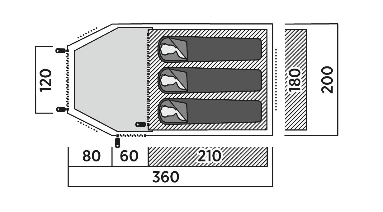 - Зовнішній тент (Flysheet): WeatherGuard 2000, 180T поліестер із PU-покриттям, без PFC, вогнестійкий