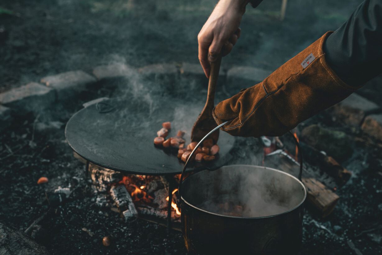 Теплозахисні рукавички зі шкіри захищають ваші руки під час роботи з гарячими предметами біля багаття. Рукавички забезпечують довговічність та безпеку.