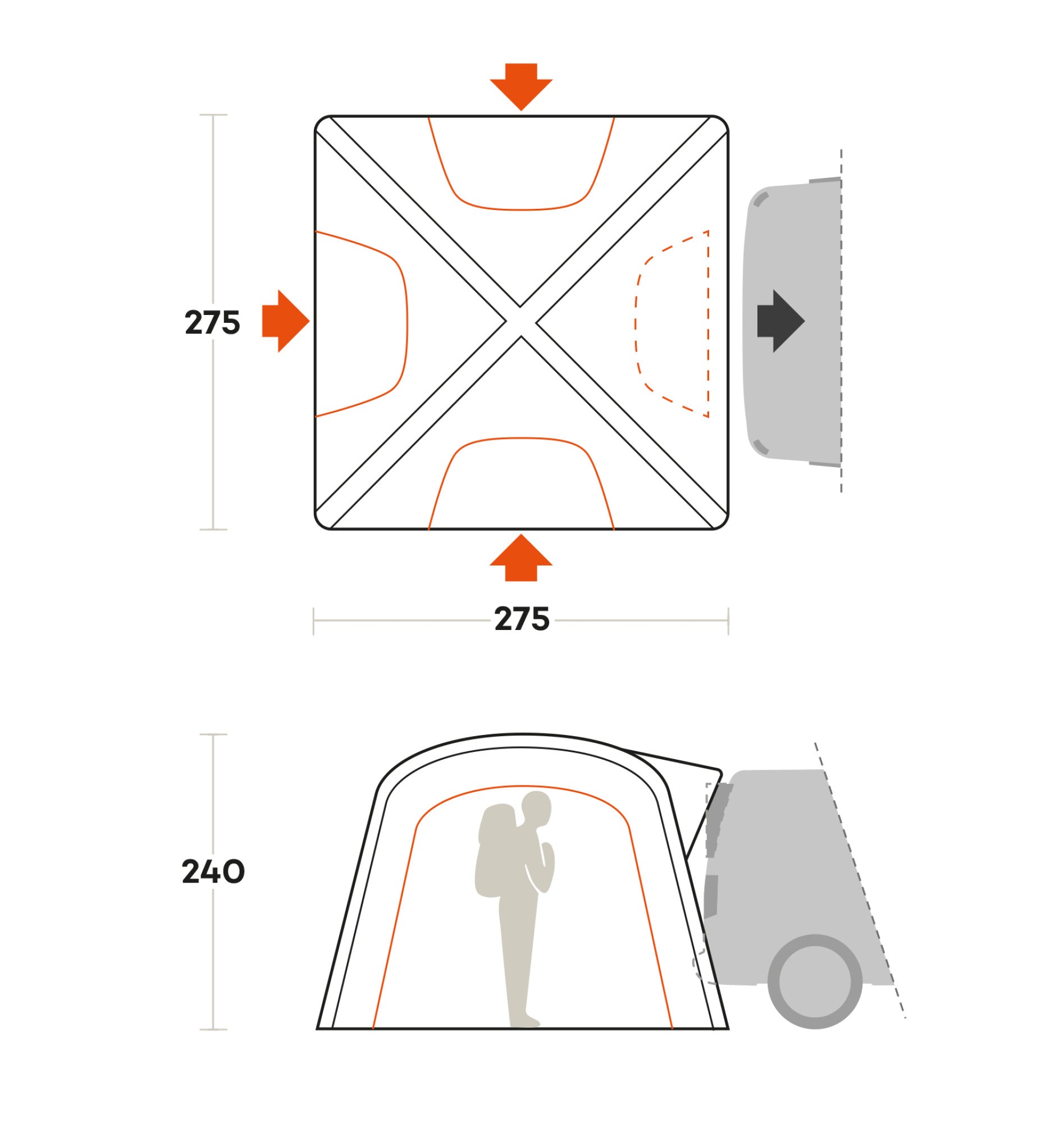 - Зовнішній тент: 70D поліестер Diamond, 75 г/м² з алюмінієвим PU покриттям, водостійкість 2000 мм