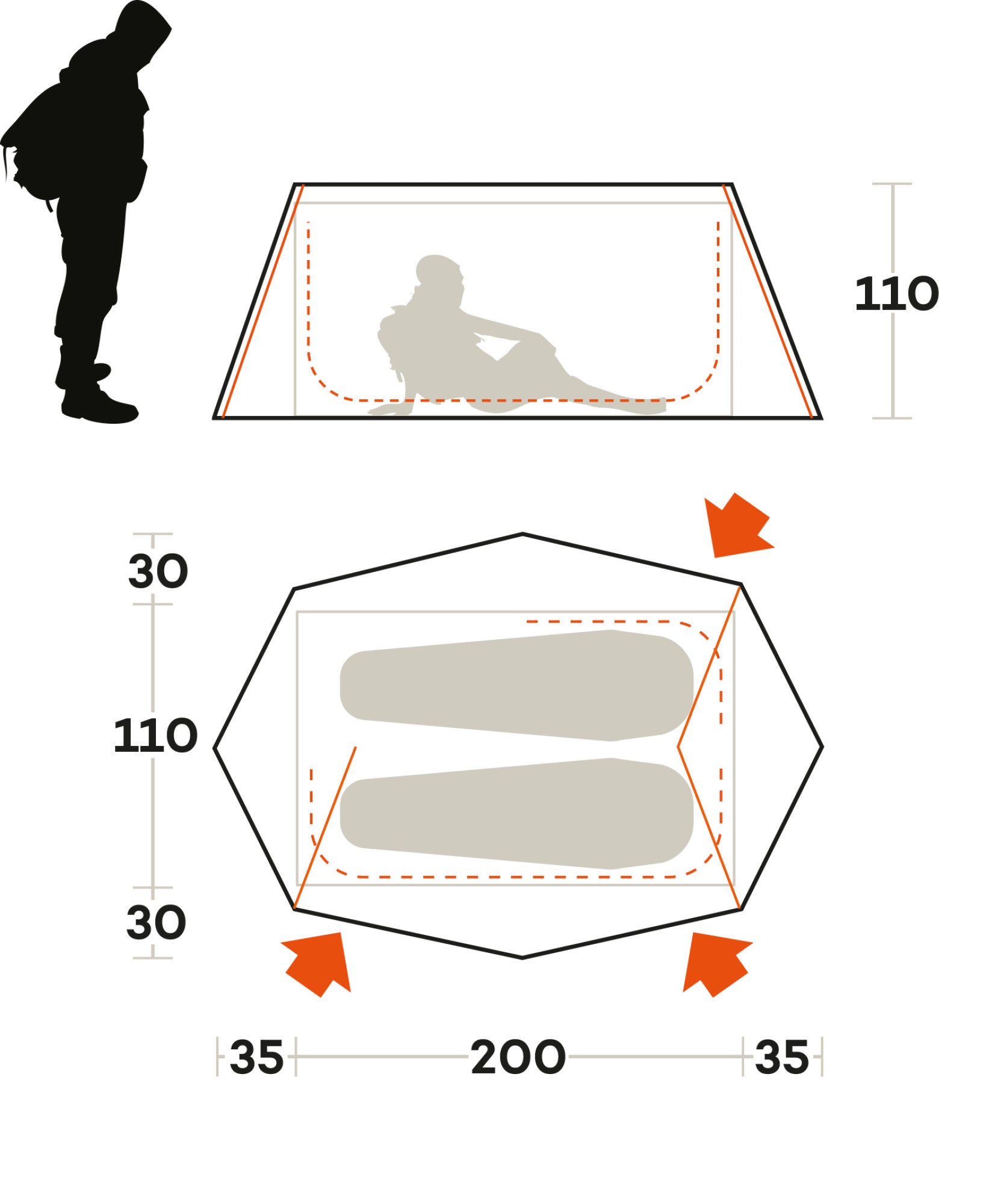 Легкий та компактний, Ferrino Den 2 ідеально підходить для багатоденних трекінгових пригод. Розроблений для встановлення з трекінговими палицями (мін. 110 см, не входять до комплекту), він економить місце та вагу у вашому рюкзаку, водночас забезпечуючи надійне та захищене від негоди укриття.