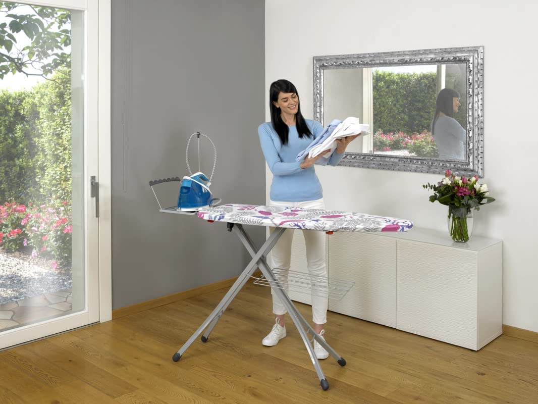 Інноваційна прасувальна дошка Advance від компанії Gimi - надійна, міцна, адаптована для прасування всіляких видів білизни та одягу. Конструкція обладнана підставкою для праски або середнього за габаритами парогенератора. Підставка доповнена спеціальним поворотним механізмом для людей, які переважно використовують ліву руку. Широка робоча поверхня дошки дозволяє з легкістю випрасувати білизну різних форм і великих розмірів, штори або двоспальні постільні набори. Для додаткового комфорту модель оснащена тримачем для кабелю, розкладним кронштейном для тремпелів, телескопічною висувною підставкою і полицею для білизни.