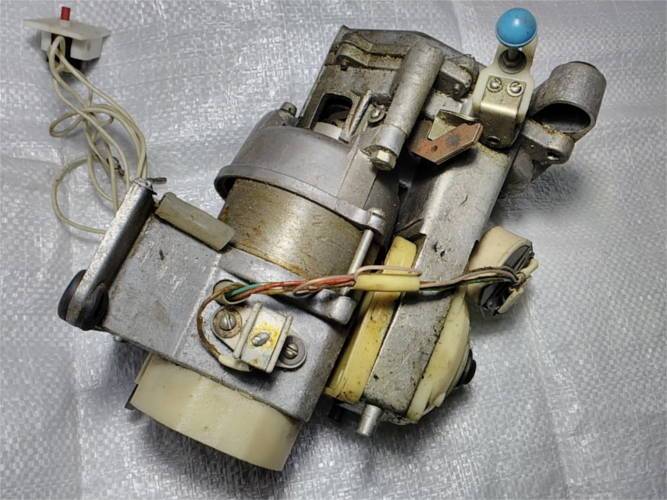 Редуктор кухонного комбайна Мрия в сборе с электродвигателем. Также на борту: кнопка включения, рычаг, все фланцы на месте, ПЕРЕКЛЮЧАТЕЛЬ РЕЖИМОВ ОТСУТСТВУЕТ.