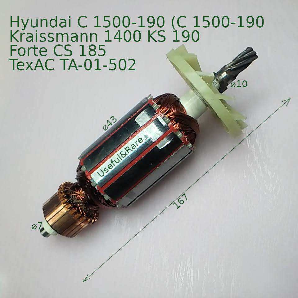 Якорь циркулярной пилы Зенит ЗПЦ-1950, Forte CS 185, Kraissmann 1400 KS 190, TexAC TA-01-502, Hyundai C 1500-190 (C 1500-190 диаметром 43 мм, длина 167 мм, 6 зубов вправо, длина пакета 50 мм, Посадочное расстояние (между подшипниками) 137 мм