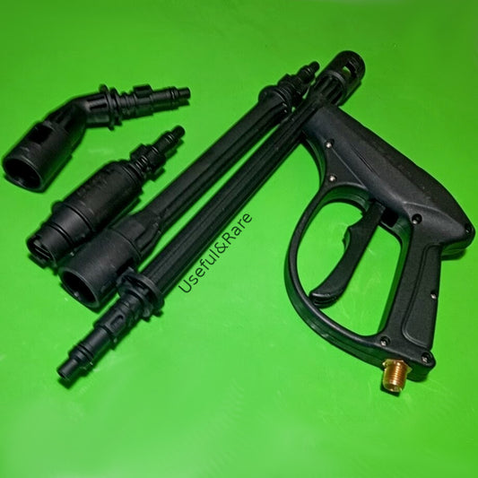 Универсальный пистолет-брандспойт автомойки высокого давления, соединение шланга через штуцер 14 или 22 (через переходник), в комплекте две насадки (плоская струя и фреза), уголок удлинителя и удлинитель на быстросъёмных коннекторах.