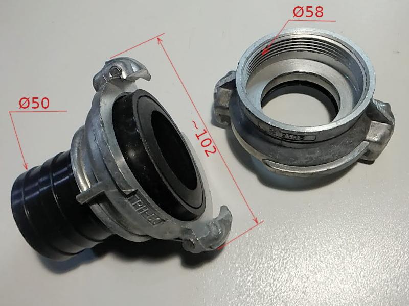 Быстросъемное соединение шланга с пластиковым патрубком 50 мм и внутренней резьбой 58 мм, для фекального, водяного или пожарного насоса