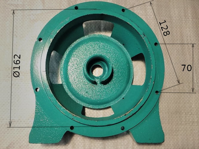 Центральная полукруглая чугунная опора насосной станции Euroaqua JV1000 (нержавеющая крышка) с ногами, между винтами к двигателю по диагонали 124 мм, между соседними 86 мм. Диаметр соединительного выступа к насосной части 162 мм. Основные размеры смотрите на чертежах