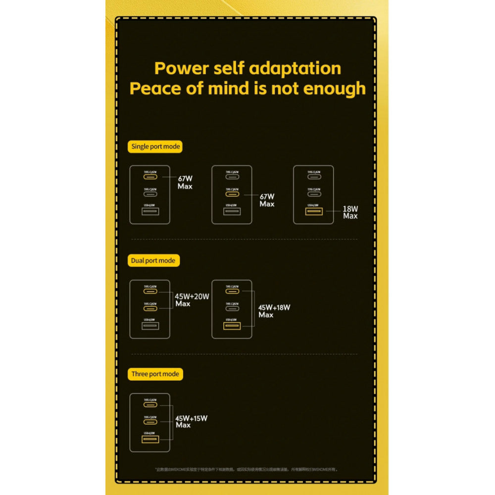 Высокая мощность: 67 Вт для эффективного одновременного заряда трёх устройств.