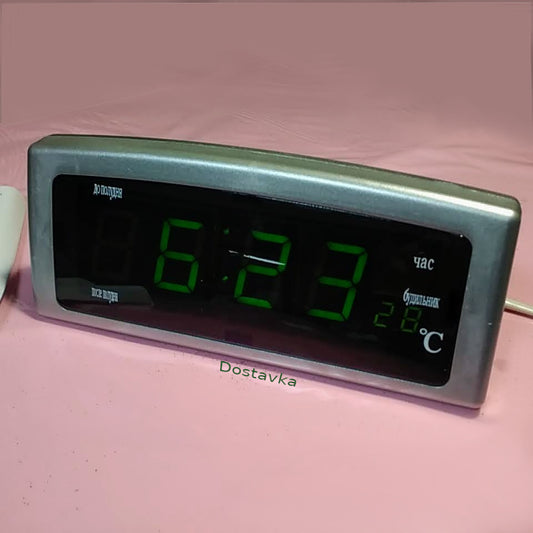 Большой LED дисплей, часы (12/24-х часовой формат), будильник, число, месяц, внутренняя температура; Питание: от сети 220V.