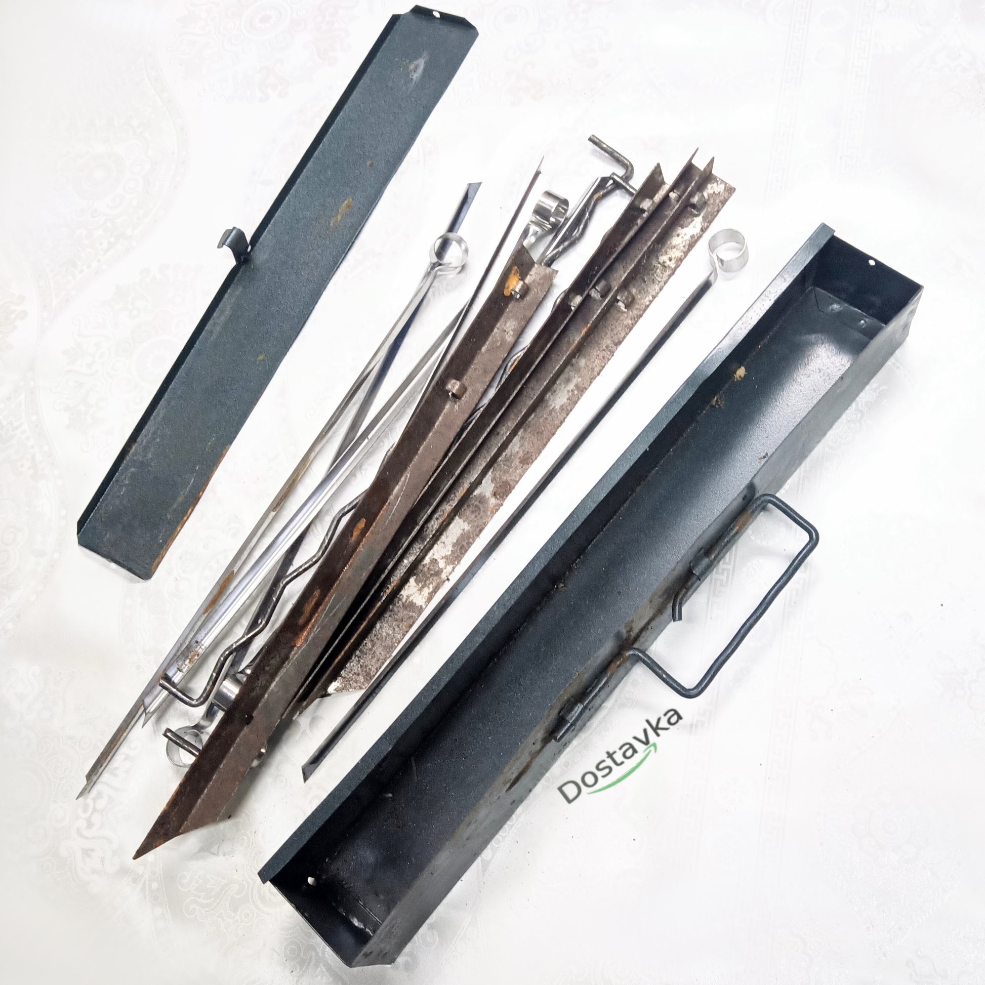 Состоит из двух волнистых перегородок, которые создают ячейки для шампуров, и 4 ножек, которые втыкаются в землю. В наборе также 6 шампуров (40 см) из нержавеющей стали и металлический ящичек с ручкой для транспортировки. Размеры в упакованном виде: 43 х 6 х 6 см.