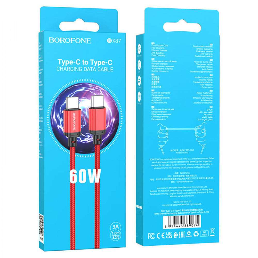 BOROFONE BX87 Sharp, кабель для зарядки и передачи данных USB-C на USB-C, 1м, поддержка зарядки 60W (20V / 3A) для ноутбука, тока 3A для телефона