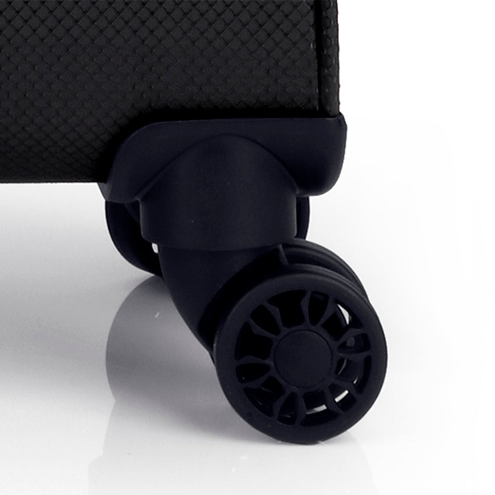Валіза оснащена чотирма колесами із можливістю розвороту на 360°. Конструкція забезпечує рівномірний перерозподіл навантаження на кожне колесо, що сприяє плавному руху та маневреності валізи. Колеса виготовлені з термопластичного поліуретану (TPU). Цей матеріал має міцність порівнянну з пластиком, гнучкістю силікону, а також підвищену стійкість до перепадів температури та стирання. Завдяки цьому колеса мають тривалий термін експлуатації. Відмінною особливістю коліс із TPU-матеріалу є зниження шуму до мінімуму під час руху валізи нерівною поверхнею.