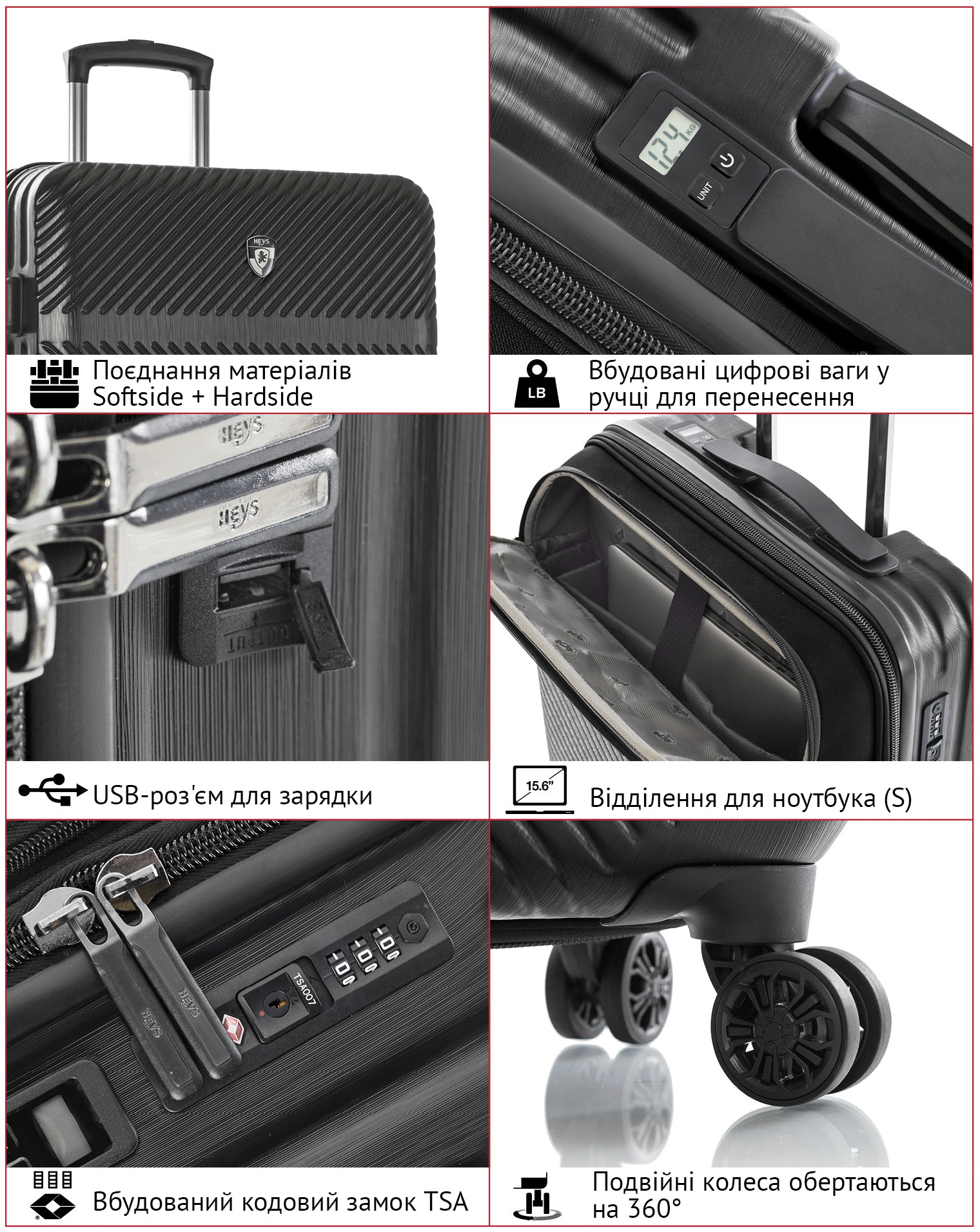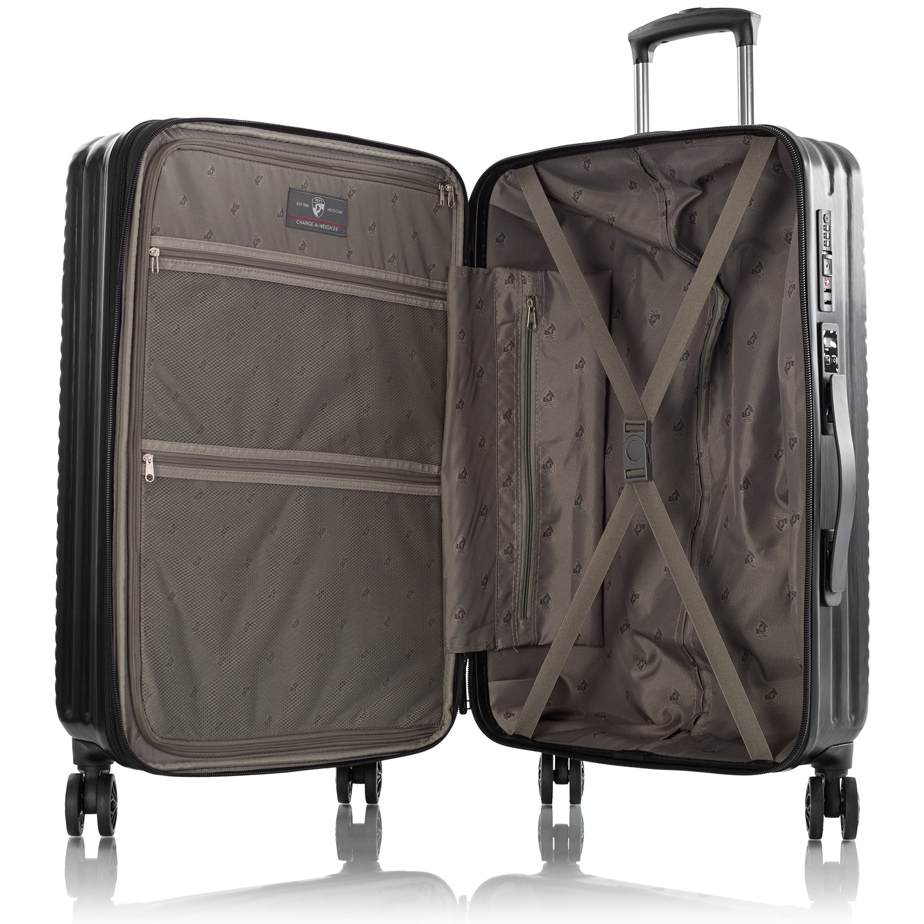 Серія валіз Charge-A-Weigh ll від Heys втілила у своєму дизайні лаконічність, стиль та сміливість геометричного візерунка. Матове металеве оздоблення надає елегантного зовнішнього вигляду та допомагає запобігти появі царапин та потертостей на поверхні. Виготовлений із композитного полікарбонату: легкий, міцний та ударостійкий матеріал, що використовується при виробництві пуленепробивного стекла.