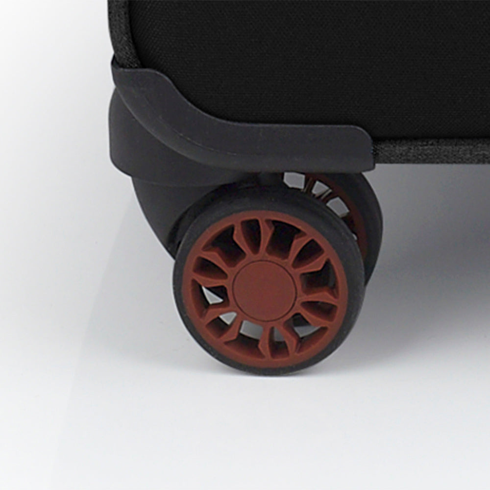Валіза оснащена чотирма повноповоротними колесами із можливістю незалежного розвороту шкірного колеса на 360°. Системою передбачено рівномірний перерозподіл навантаження на кожне колесо, що в свою чергу сприяє плавному руху та маневреності валізі, докладаючи при цьому мінімум зусиль. Колеса виготовлені із високотемпературного термопластичного поліуретану (TPU). Матеріал має міцність порівнянну з пластиком, гнучкістю силікону, а також має підвищену стійкість до перепадів температур. Відмінною особливістю коліс із TPU матеріалу є зниження шуму до мінімуму під час руху валізи по нерівній поверхні. Завдяки стійкості до стирання матеріал коліс відрізняється тривалим терміном експлуатації.