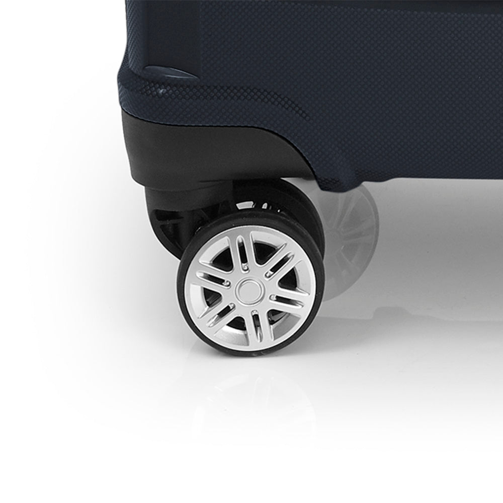 Валіза оснащена чотирма повноповоротними колесами із можливістю незалежного розвороту шкірного колеса на 360°. Системою передбачено рівномірний перерозподіл навантаження на кожне колесо, що в свою чергу сприяє плавному руху та маневреності валізі, докладаючи при цьому мінімум зусиль. Колеса виготовлені із високотемпературного термопластичного поліуретану (TPU). Матеріал має міцність порівнянну з пластиком, гнучкістю силікону, а також має підвищену стійкість до перепадів температур. Відмінною особливістю коліс із TPU матеріалу є зниження шуму до мінімуму під час руху валізи по нерівній поверхні. Завдяки стійкості до стирання матеріал коліс відрізняється тривалим терміном експлуатації.