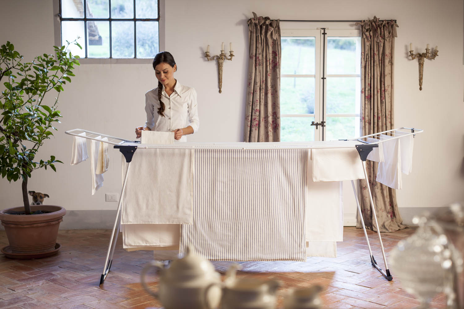 Сталеві елементи конструкції мають антикорозійне покриття. Одна з опорних стійок обладнана роликовим механізмом, завдяки якому переміщення всієї конструкції житловим приміщенням стало надзвичайно легким і максимально безпечним по відношенню до поверхні підлоги. Робочі напрямні збільшеного діаметра не залишають смуги на білизні у процесі сушіння. Надійна та практична, виготовлена з екологічно чистих матеріалів, сушарка для білизни Gimi Dinamik 30 стане надійним помічником, як у приватному будинку, так і у квартирі.