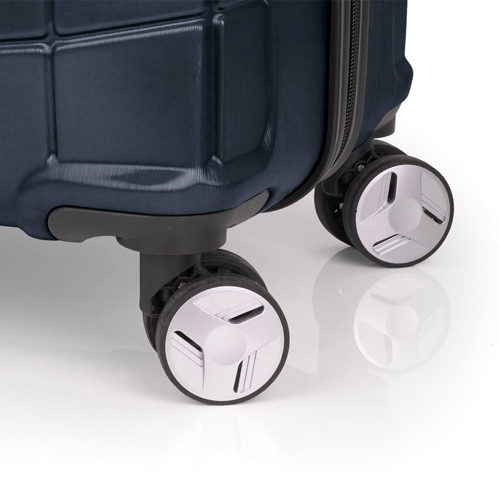 Валіза оснащена чотирма повноповоротними колесами з можливістю незалежного розвороту шкірного колеса на 360°. Системою передбачено рівномірний перерозподіл навантаження на кожне колесо, що в свою чергу сприяє плавному руху та маневреності валізі, докладаючи при цьому мінімум зусиль. Колеса виготовлені із високотемпературного термопластичного поліуретану (TPU). Матеріал має міцність порівнянну з пластиком, гнучкістю силікону, а також має підвищену стійкість до перепадів температур. Відмінною особливістю коліс із TPU матеріалу є зниження шуму до мінімуму під час руху валізи по нерівній поверхні. Завдяки стійкості до стирання матеріал коліс відрізняється тривалим терміном експлуатації.
