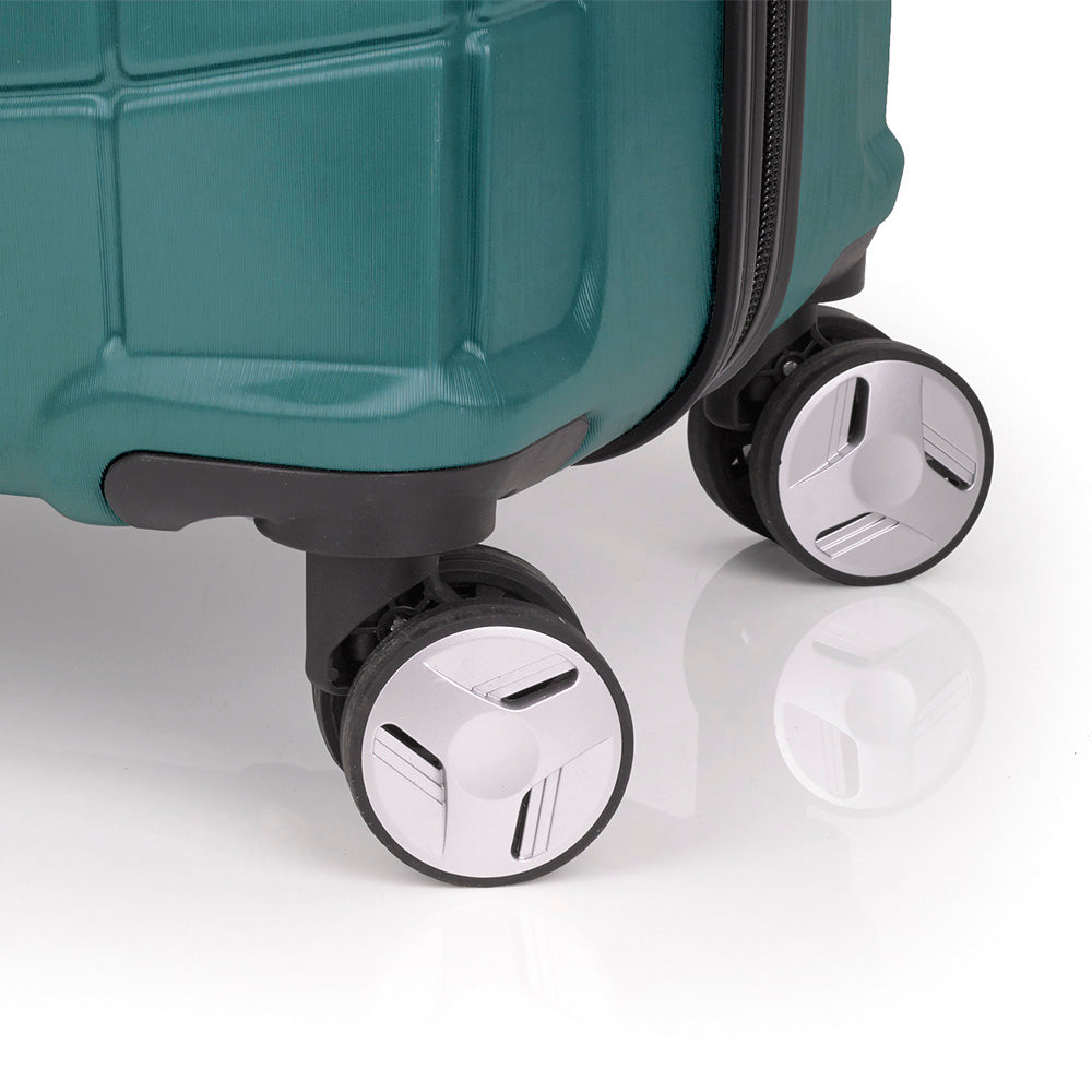 Валіза оснащена чотирма повноповоротними колесами з можливістю незалежного розвороту шкірного колеса на 360°. Системою передбачено рівномірний перерозподіл навантаження на кожне колесо, що в свою чергу сприяє плавному руху та маневреності валізі, докладаючи при цьому мінімум зусиль. Колеса виготовлені із високотемпературного термопластичного поліуретану (TPU). Матеріал має міцність порівнянну з пластиком, гнучкістю силікону, а також має підвищену стійкість до перепадів температур. Відмінною особливістю коліс із TPU матеріалу є зниження шуму до мінімуму під час руху валізи по нерівній поверхні. Завдяки стійкості до стирання матеріал коліс відрізняється тривалим терміном експлуатації.