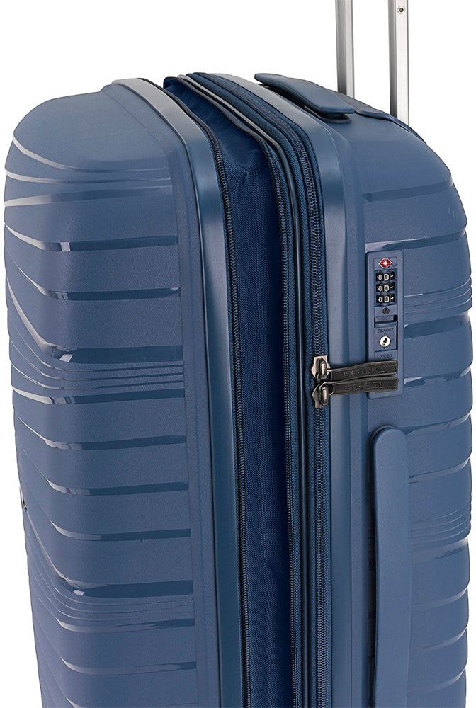 Корпус валіз Gabol серії Kiba виготовлений з міцного та довговічного матеріалу - поліпропілену, що дуже важливо для валіз які перевозяться у багажних відділеннях. Внутрішній об'єм розділень перегородкою на два відділення та має ремені для фіксації промов усередині. Валіза забезпечена розширювальним клапаном, який дозволяє збільшити об'єм до 80 літрів.