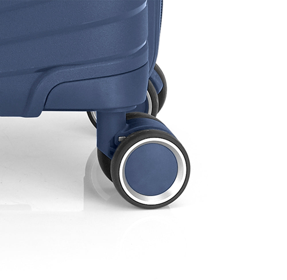 Валіза оснащена чотирма повноповоротними колесами із можливістю незалежного розвороту шкірного колеса на 360°. Системою передбачено рівномірний перерозподіл навантаження на кожне колесо, що в свою чергу сприяє плавному руху та маневреності валізі, докладаючи при цьому мінімум зусиль. Колеса виготовлені із високотемпературного термопластичного поліуретану (TPU). Матеріал має міцність порівнянну з пластиком, гнучкістю силікону, а також має підвищену стійкість до перепадів температур. Відмінною особливістю коліс із TPU матеріалу є зниження шуму до мінімуму під час руху валізи по нерівній поверхні. Завдяки стійкості до стирання матеріал коліс відрізняється тривалим терміном експлуатації.