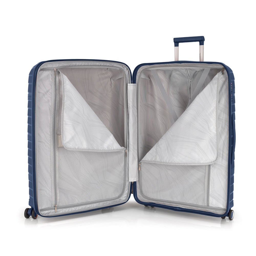Корпус валіз Gabol серії Kiba виготовлений з міцного та довговічного матеріалу - поліпропілену, що дуже важливо для валіз які перевозяться у багажних відділеннях. Внутрішній об'єм розділень перегородкою на два відділення та має ремені для фіксації промов усередині. Валіза має розширювальний клапан, який дозволяє збільшити об'єм до 124 літрів.