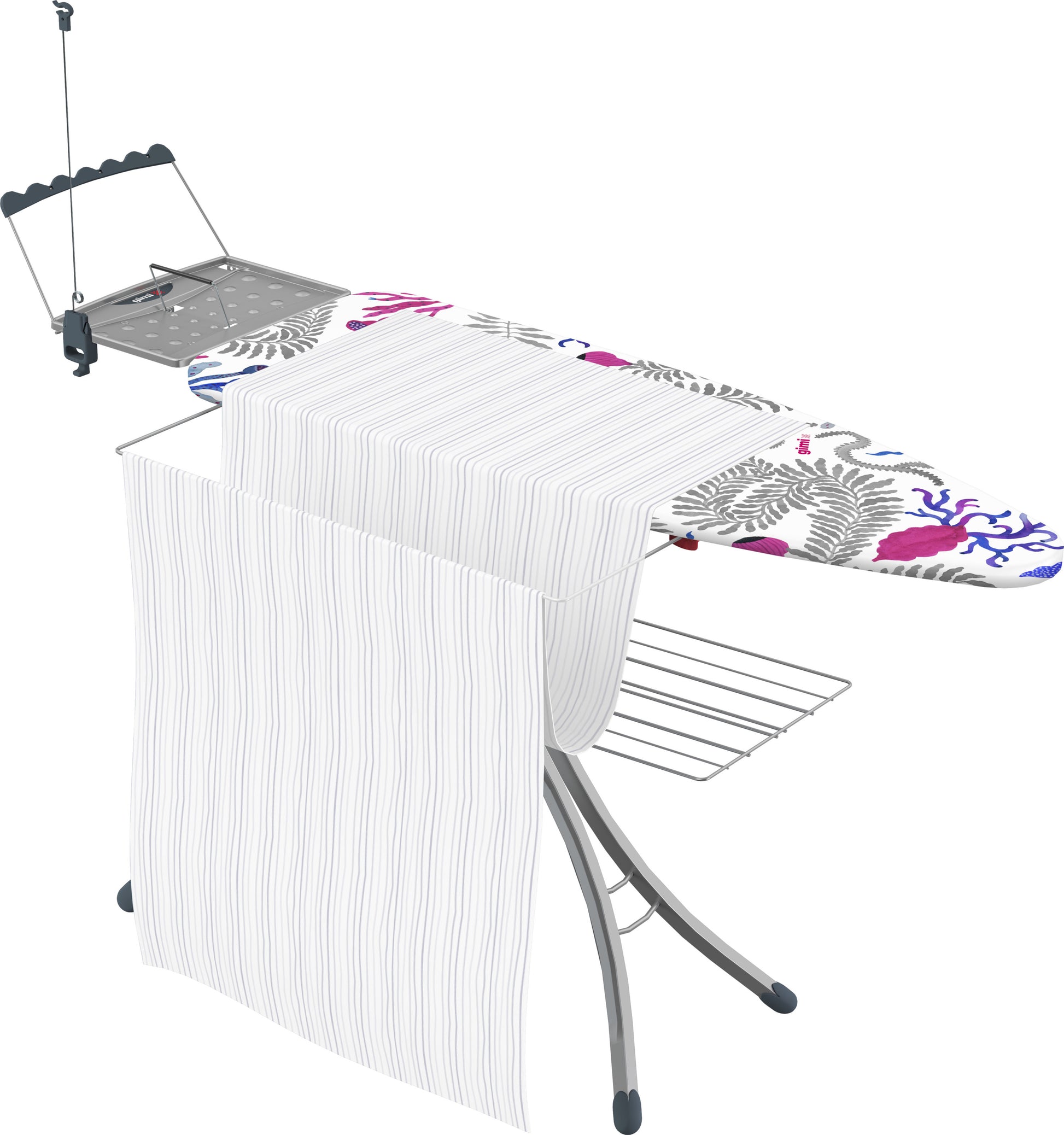 Інноваційна прасувальна дошка Advance від компанії Gimi - надійна, міцна, адаптована для прасування різноманітних видів білизни та одягу. Конструкція обладнана підставкою для утюгу або середнього за габаритами парогенератора. Підставка доповнена спеціальним поворотним механізмом для людей, які переважно використовують ліву руку. Широка робоча поверхня дошки дозволяє легко випрасувати білизну різних форм і великих розмірів, штори або двоспальні постільні набори. Для додаткового комфорту модель оснащена тримачем для кабелю, розкладним кронштейном для тремпелів, телескопічною висувною підставкою та поліцею для білизни.
