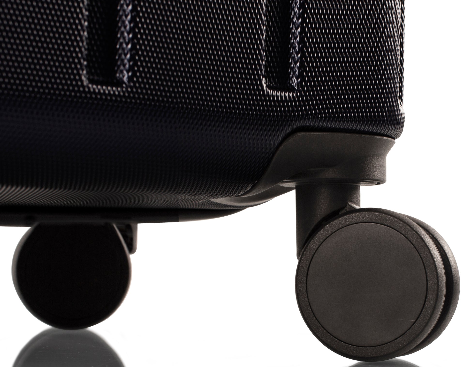 Валіза оснащена чотирма спареними повноповоротними колесами з можливістю незалежного розвороту шкірного колеса на 360°. Системою передбачено рівномірний перерозподіл навантаження на кожне колесо, що в свою чергу сприяє плавному коченню та маневреності валізі, докладаючи при цьому мінімум зусиль. Також система дозволяє швидку зміну коліс без залучення сервісного центру.