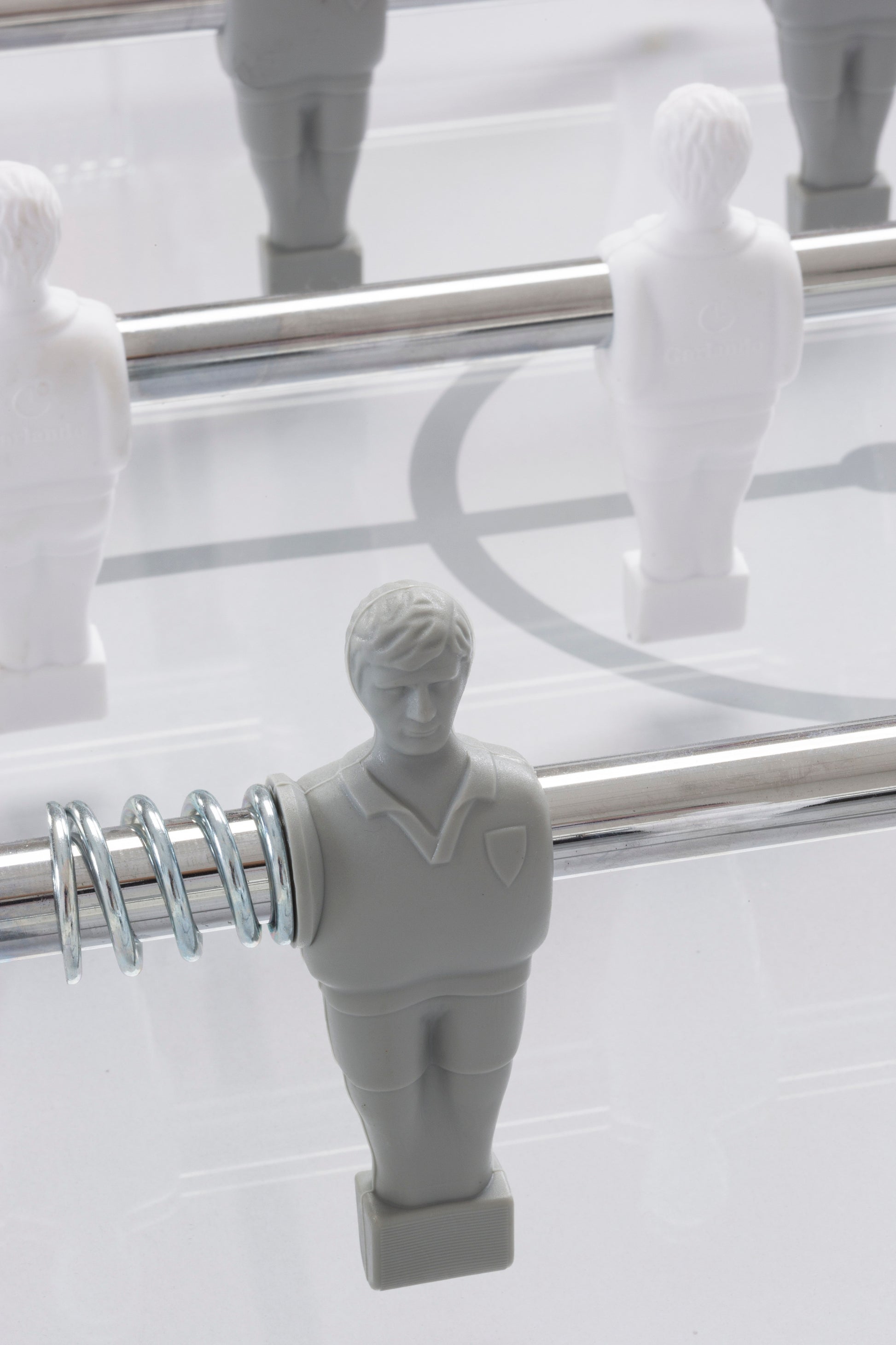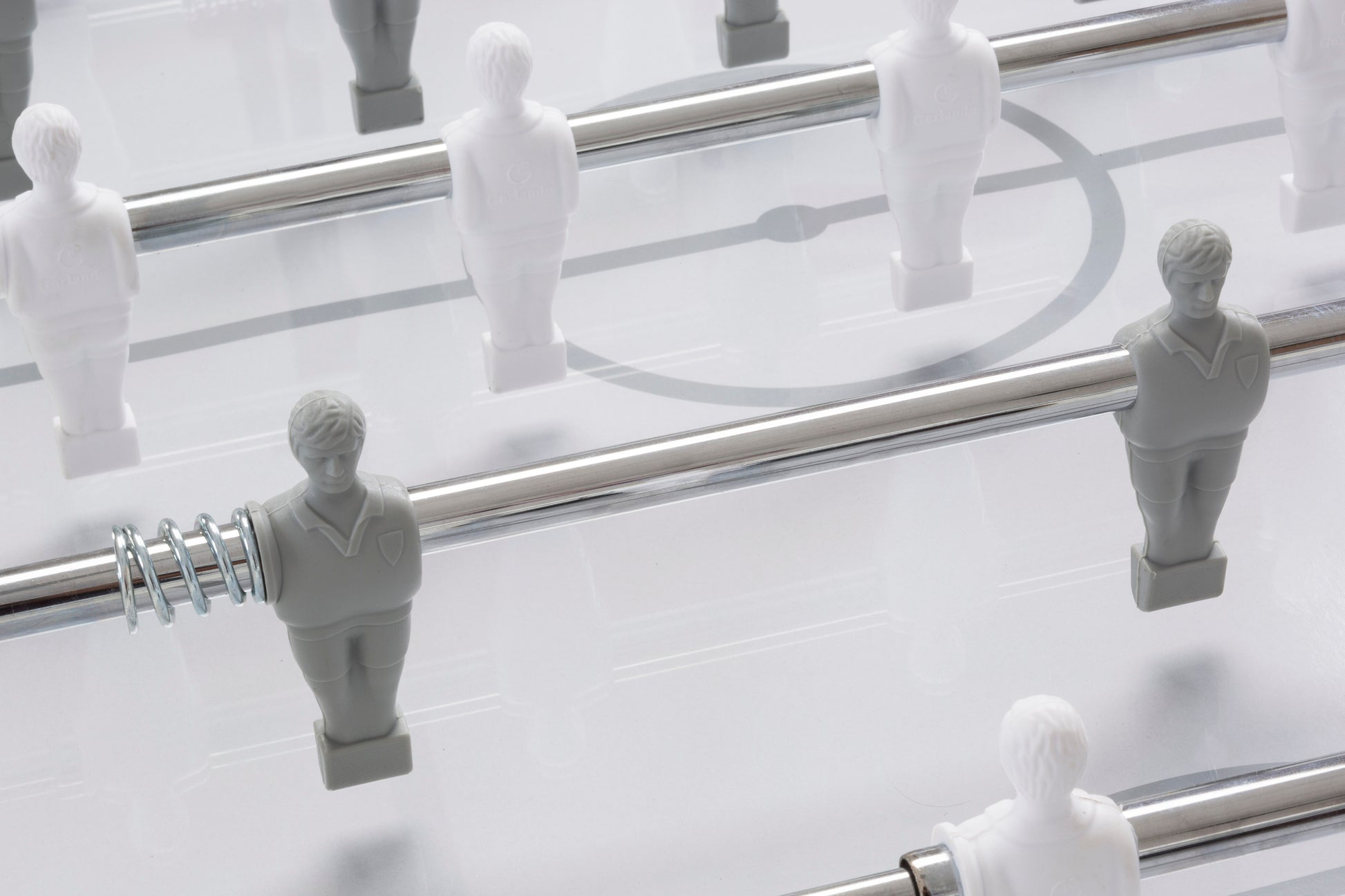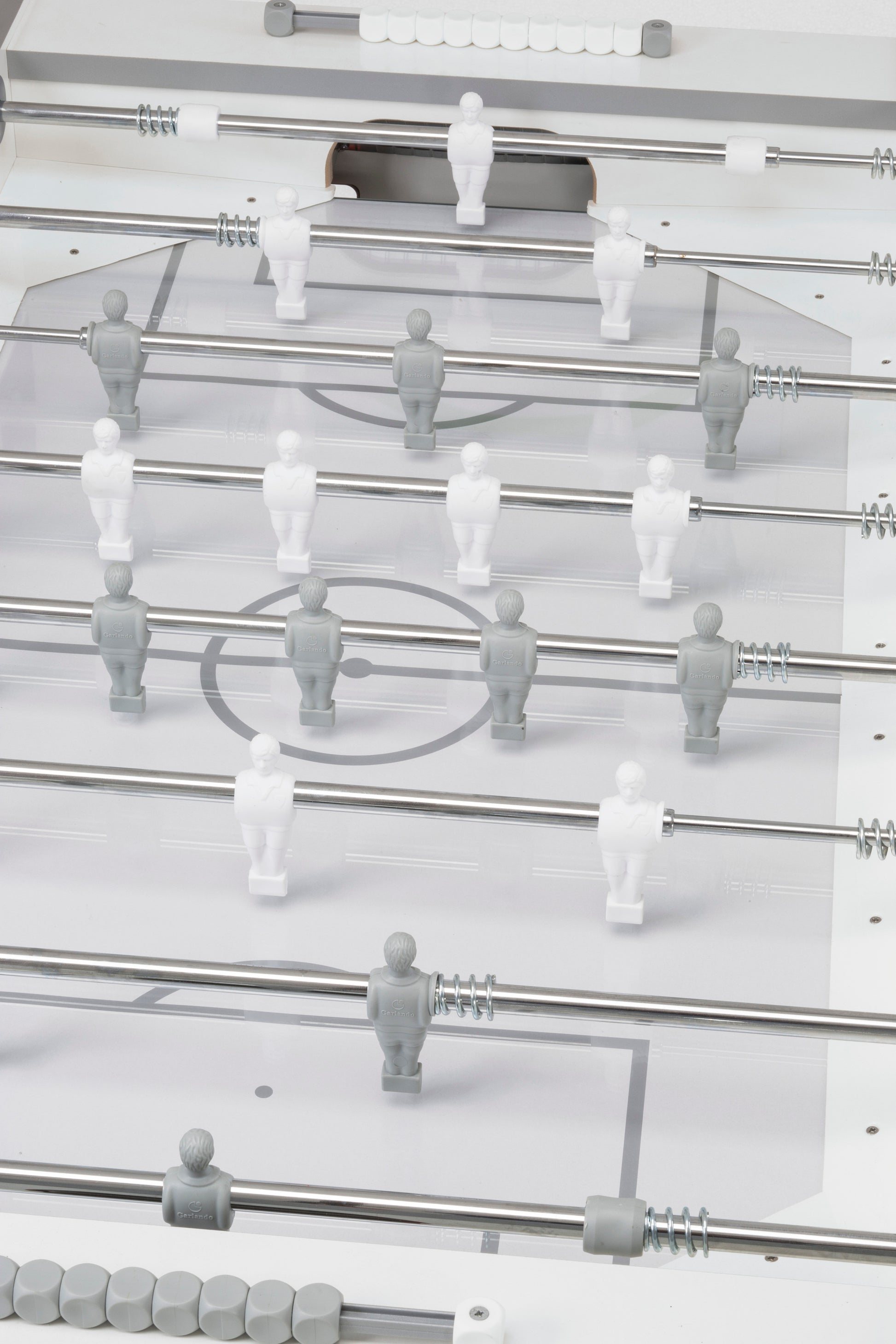 - Ігрове поле із загартованого скла товщиною 5 мм. Сріблясті лінії на білому тлі нанесені методом шовкографії, відтворюючи футбольне поле.