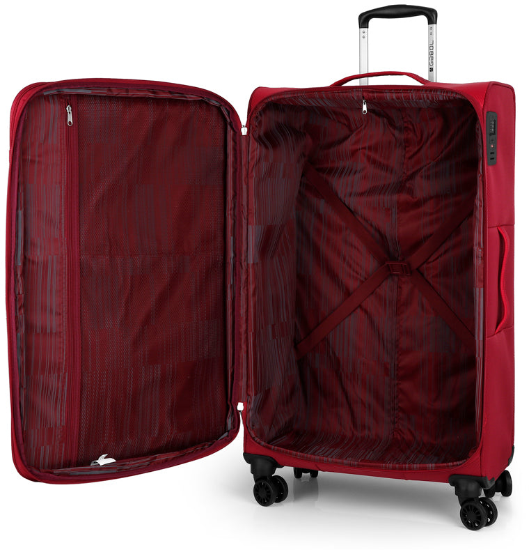 Валіза Gabol Cloud (L) Red (114047-008) виготовлена з поліестеру і це відмінний варіант для тканинного багажу. Каркас дна легкий та міцний. На фронтальній частині розміщено дві кармани на блискавці. Внутрішній простір має одне основне відділення з ремнями для фіксації промов. Валіза легка, маневрена та зручна для транспортування. Валіза оснащена чотирма колесами із можливістю розвороту на 360°. Конструкція забезпечує рівномірний перерозподіл навантаження на кожне колесо, що сприяє плавному руху та маневреності валізи. Колеса виготовлені з термопластичного поліуретану (TPU). Цей матеріал має міцність порівнянну з пластиком, гнучкістю силікону, а також підвищену стійкість до перепадів температури та стирання. Завдяки цьому колеса мають тривалий термін експлуатації. Відмінною особливістю коліс із TPU-матеріалу є зниження шуму до мінімуму під час руху валізи нерівною поверхнею.