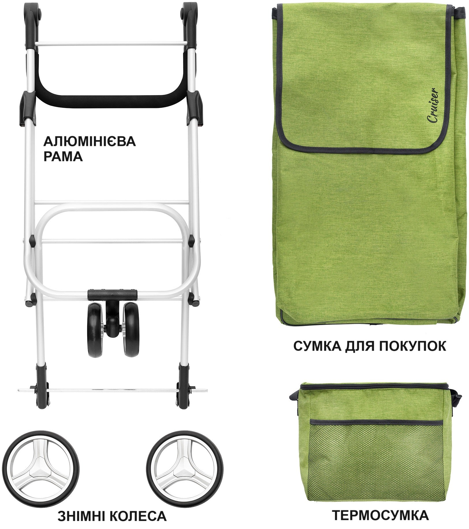 Сумка-візок ShoppingCruiser 3 Wheels Green (650071) втілює в собі легкість, міцність, стійкість, компактність. Триколісна система забезпечує стабільність і маневреність, а також можливість везти візок попереду вас. Конструкцією шасі передбачено триточкову опору коліс, завдяки чому сумка-візок стійка та може служити користувачеві додатковою опорою при пересуванні. Передня пара коліс має можливість незалежного розвороту на 360°, що дозволяє легко маневрувати під час руху.