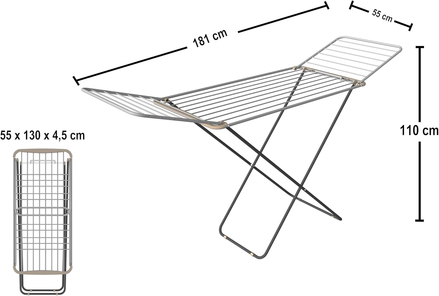 Загальна довжина струн сушарки становить двадцять метрів, що дає змогу одночасно висушити велику кількість білизни. На крайніх струнах відкидних секцій зручно сушити довге білизну. Максимальне навантаження до дев'яти кілограмів. Підлогова сушарка для білизни проста у використанні та займає мінімум місця у складеному стані.