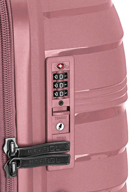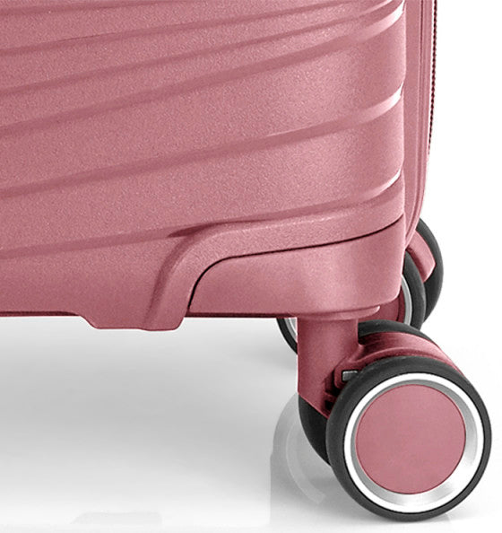 Валіза Gabol Kiba (S) Rosa (122022-019) оснащена чотирма повноповоротними колесами з можливістю незалежного розвороту кожного колеса на 360°. Системою передбачено рівномірний перерозподіл навантаження на кожне колесо, що у свою чергу сприяє плавному руху та маневреності валізи, докладаючи при цьому мінімум зусиль. Колеса виготовлені із високотемпературного термопластичного поліуретану (TPU). Матеріал має міцність порівнянну з пластиком, гнучкістю силікону, а також має підвищену стійкість до перепадів температур. Відмінною особливістю коліс із TPU матеріалу є зниження шуму до мінімуму під час руху валізи по нерівній поверхні. Завдяки стійкості до стирання матеріал коліс відрізняється тривалим терміном експлуатації. Валіза обладнана фірмовим кодовим замком з функцією митного огляду TSA (Transportation Security Administration – Адміністрація з безпеки на транспорті).