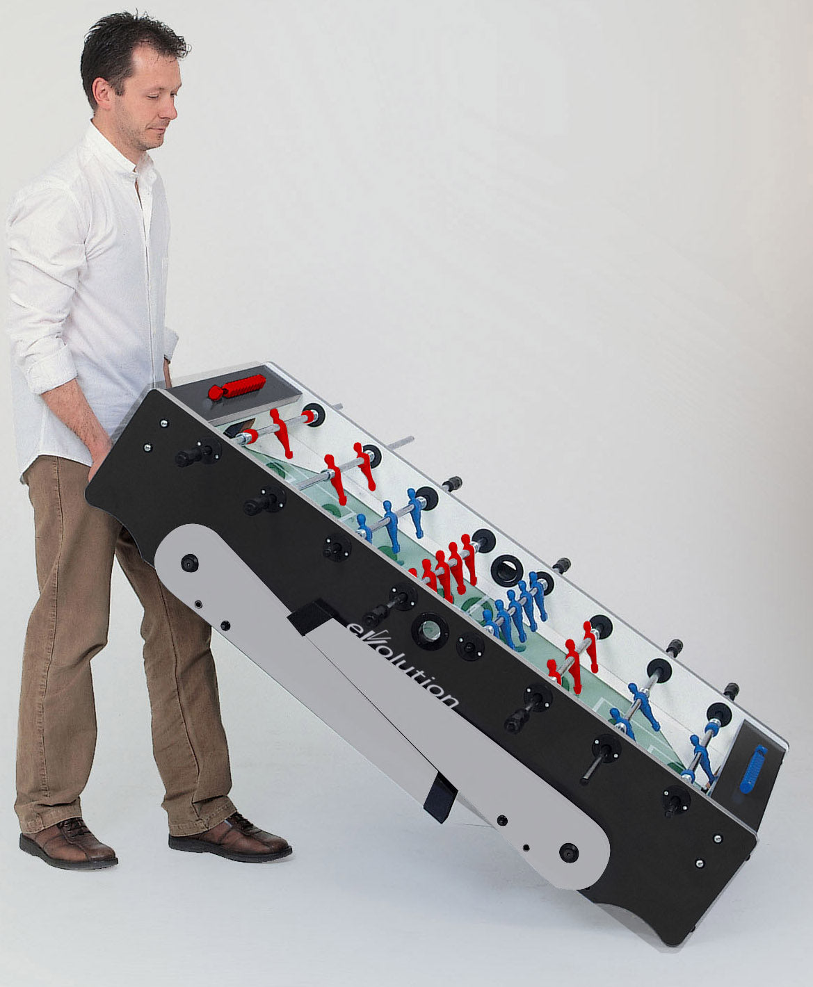 Настільний футбол Garlando Foldy Evolution Telescopic (FOLDYNERLVS) зі складаними ніжками для компактного зберігання - ідеальний варіант для невеликого приміщення. Міцна конструкція стола має елегантне поєднання чорного та сріблястого кольорів, натхненного стилем хай-тек. Модель виготовлена безпосередньо в Італії з високоякісних матеріалів, що забезпечують довговічність і задоволення від гри, з урахуванням конкретних вимог, яким повинен відповідати футбольний стіл. Цей стіл характеризується надійністю та стійкістю, що робить його придатним для гри в будь-якому місці: від дому до офісу та бару. Настільний футбол Garlando Foldy Evolution Telescopic (FOLDYNERLVS) відповідає європейським стандартам безпеки EN 71-1, 71-2, 71-3 та 71-9.