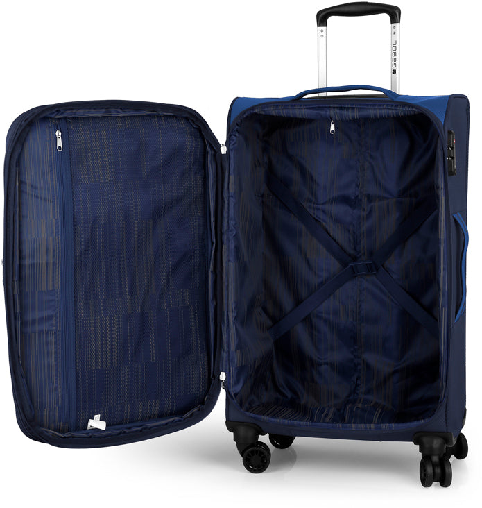 Валіза Gabol серії Cloud є однією з найлегших у своєму класі. Модель оснащена кодовим замком TSA системи для підвищення безпеки. Каркас дна легкий та міцний. На фасадній частині розміщено два кармани на блискавці. Усередині основне відділення має ремені для фіксації промов. Валіза легка, маневрена та зручна для транспортування.