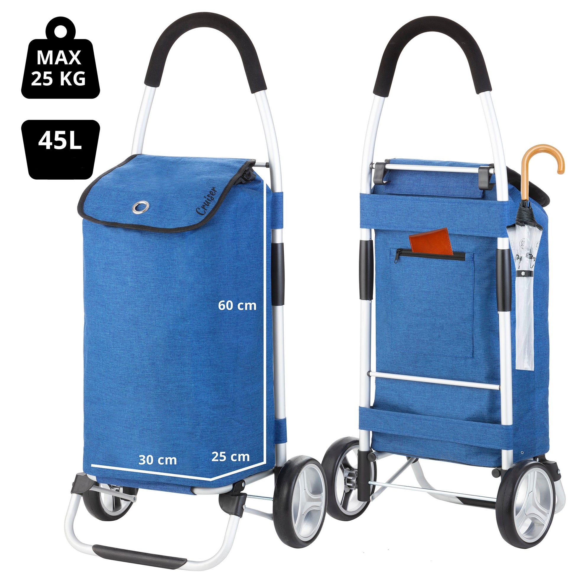 Сумка-візок ShoppingCruiser Foldable Blue (650061) має велике основне відділення для ваших покупок. Виготовлена з водостійкого нейлону з додатковим водозахисним покриттям. Її можна легко зняти з візка та використовувати окремо. Завдяки легкій алюмінієвій рамі та складній опорній частині дана модель зручна в транспортуванні та зберіганні. Колеса можна швидко зняти та почистити. Неопренова ручка додає комфорту під час використання в холодну пору року. Максимальне навантаження – до 25 кг.
