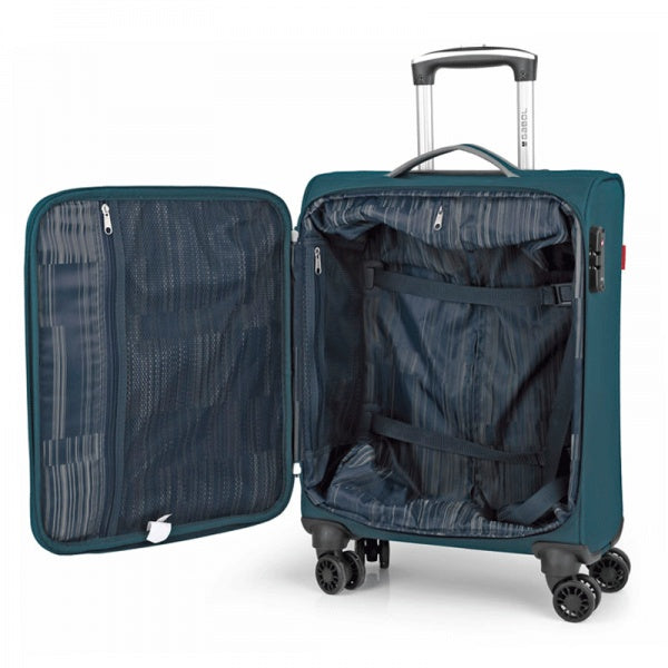 Валіза Gabol серії Zambia оснащена кодовим замком системи TSA для підвищення безпеки. Каркас дна легкий та міцний. На фасадній частині розміщено карман на блискавці. Внутрішній об'єм має ремені для фіксації промов усередині. Валіза легка, маневрена та зручна для транспортування.