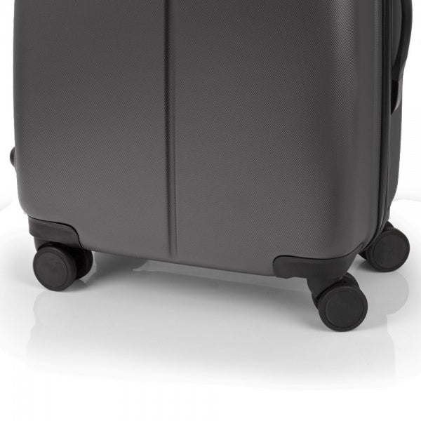 Валіза оснащена чотирма повноповоротними колесами із можливістю незалежного розвороту шкірного колеса на 360°. Системою передбачено рівномірний перерозподіл навантаження на кожне колесо, що в свою чергу сприяє плавному руху та маневреності валізі, докладаючи при цьому мінімум зусиль. Колеса виготовлені із високотемпературного термопластичного поліуретану (TPU). Матеріал має міцність порівнянну з пластиком, гнучкістю силікону, а також має підвищену стійкість до перепадів температур. Відмінною особливістю коліс із TPU матеріалу є зниження шуму до мінімуму під час руху валізи по нерівній поверхні. Завдяки стійкості до стирання матеріал коліс відрізняється тривалим терміном експлуатації.